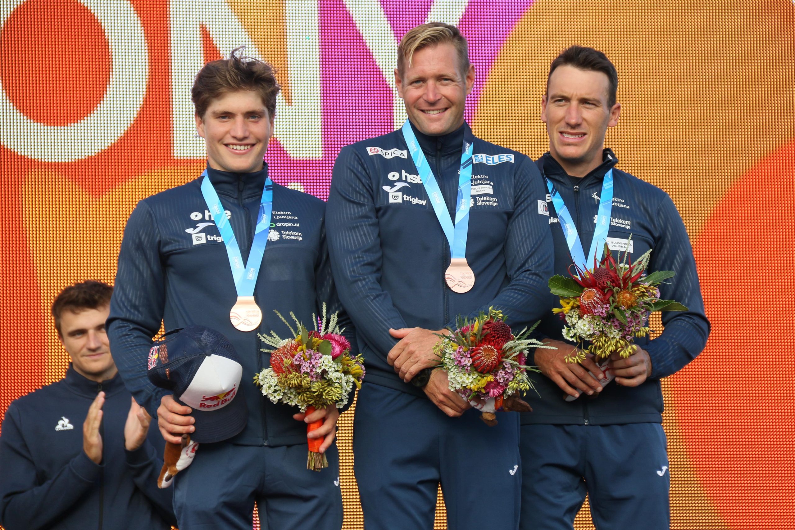 Slovenska reprezentanca v slalomu na divjih vodah se je v Sydneyju drugi dan svetovnega prvenstva v slalomu na divjih vodah razveselila še druge kolajne. Po ponedeljkovem srebru Ajde Novak v posamičnem kajakaškem krosu so kanuisti Benjamin Savšek, Luka Božič in Žiga Lin Hočevar na ekipni tekmi prišli do brona. Zlato jim je odnesel dotik, ki je pomenil dodatni dve kazenski sekundi. Sicer so Slovenci kljub dotiku za zmagovalno ekupo Francije zaostali za vsega 89 stotink. Svetovni prvaki so postali francoski predstavniki Nicolas Gestin, Mewen Debliquy in Yohann Senechault, drugi pa so bili Britanci Adam Burgess, Ryan Westley in Luc Royle, ki so zaostali za 79 stotink.