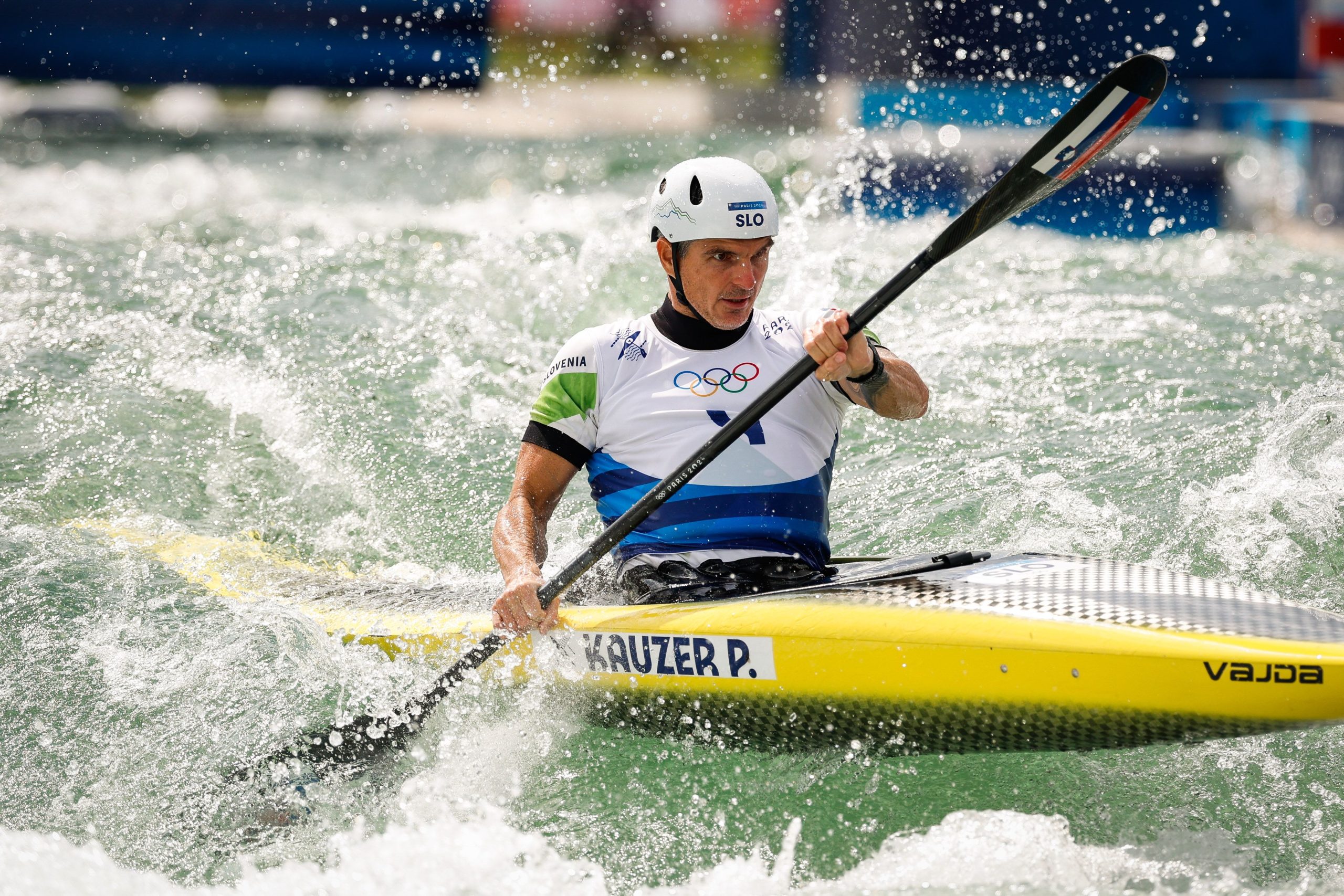 Francija, Pariz. Poletne olimpijske igre 2024 v Parizu. Slalom na divjih vodah za moske, kajak, polfinale. Slovenski kajakas Peter Kauzer.
